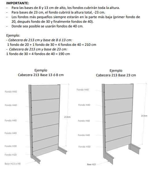 cabecera con base de 23 cm, los fondos apoyan en