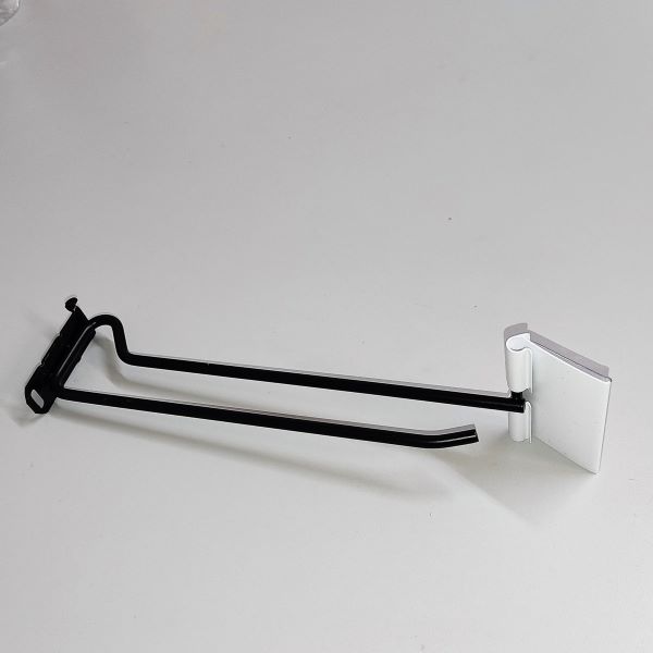 Portaetiquetas de plástico para gancho, con fondo blanco y visor transparente.